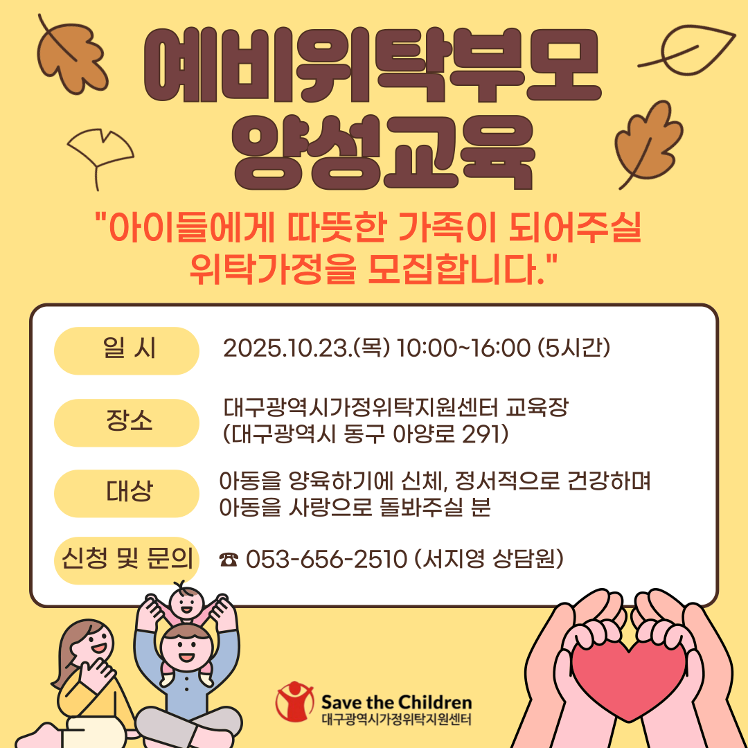 <2025³â 10¿ù ¿¹ºñÀ§Å¹ºÎ¸ð ¾ç¼º±³À°> ¾ÆÀ̵鿡°Ô µû¶æÇÑ °¡Á·ÀÌ µÇ¾îÁÖ½Ç À§Å¹°¡Á¤À» ¸ðÁýÇÕ´Ï´Ù! À§Å¹ºÎ¸ð°¡ µÇ±â À§ÇÑ,¿¹ºñÀ§Å¹ºÎ¸ð ¾ç¼º±³À° ¾È³»µå¸³´Ï´Ù. •°¡Á¤À§Å¹À̶õ? Ä£ºÎ¸ðÀÇ ¿©·¯ »çÁ¤(ÀÌÈ¥,»çº°,¼ö°¨,°æÁ¦Àû ¾î·Á¿ò µî)À¸·Î Ä£°¡Á¤¿¡¼ ÀÚ¶ö ¼ö ¾ø´Â ¾Æµ¿À» ÀÏÁ¤ ±â°£ À§Å¹ °¡Á¤¿¡¼ ¾çÀ°ÇÏ´Â ¾Æµ¿º¹Áö ¼ºñ½º •À§Å¹¾Æµ¿ ¾çÀ° Áö¿ø»çÇ× »ý°è±Þ¿© ¹× Áְű޿©,ÀÇ·á±Þ¿©,°¡Á¤¾çÀ°¼ö´ç/¿µ¾Æ¼ö´ç(ÇØ´ç °¡Á¤¿¡ ÇÑÇÔ),¾çÀ°º¸Á¶±Ý(ÀϽÃÀ§Å¹ Á¦¿Ü),¾Æµ¿¿ëǰ±¸ÀÔºñ,»óÇØº¸Çè °¡ÀÔ,½É¸®°Ë»ç¡¤Ä¡·áºñ,ºÎ¸ð±³À°,»ç·Ê°ü¸® µî •±³À°ÀϽà - 10¿ù 23ÀÏ ¸ñ¿äÀÏ 10½Ã~ 16½Ã(5½Ã°£)/*±â°ü »óȲ¿¡ µû¶ó º¯µ¿µÉ ¼ö ÀÖÀ½. •±³À°Àå¼Ò -´ë±¸±¤¿ª½Ã°¡Á¤À§Å¹Áö¿ø¼¾ÅÍ ±³À°Àå(´ë±¸ µ¿±¸ ¾Æ¾ç·Î291) •±³À°´ë»ó -ÀϹÝÀ§Å¹ºÎ¸ðÀÇ ÀÚ°Ý ¿ä°ÇÀ» ¸ðµÎ ÃæÁ·ÇÑ ÀÚ ÀϹÝÀ§Å¹ºÎ¸ð ÀÚ°Ý ¿ä°Ç: ¨çÀ§Å¹¾Æµ¿À» ¾çÀ°Çϱ⿡ ÀûÇÕÇÑ ¼öÁØÀÇ ¼ÒµæÀÌ ÀÖ´Â °¡Á¤ ¨è³ªÀ̰¡ 25¼¼ ÀÌ»óÀ̸ç,À§Å¹¾Æµ¿°úÀÇ ³ªÀÌ Â÷À̰¡ 60¼¼ ¹Ì¸¸ÀÎ °¡Á¤ ¨éÁ¾±³ÀÇ ÀÚÀ¯¸¦ ÀÎÁ¤Çϰí,À§Å¹¾Æµ¿À» ½Åü¡¤Á¤¼ÀûÀ¸·Î °ÇÀüÇÏ°Ô ¼ºÀåÇÒ ¼ö ÀÖµµ·Ï Áö¿øÇÒ ¼ö ÀÖ´Â °¡Á¤ ¨ê18¼¼ ¹Ì¸¸ Ä£Àڳడ3¸í ÀÌÇÏÀÎ °¡Á¤,¼º¹üÁË,°¡Á¤Æø·Â,¾Æµ¿Çдë,¸¶¾à,¾ËÄÚ¿Ã,¾à¹°Áßµ¶,Á¤½ÅÁúȯ µîÀÇ Àü·ÂÀÌ ¾ø´Â °¡Á¤ ¡ØÀü¹®°¡Á¤À§Å¹:°¡Á¤À§Å¹ º¸È£°¡ ÇÊ¿äÇÑ ¾Æµ¿ Áß 36°³¿ù ¹Ì¸¸ ¾Æµ¿,Çдë ÇÇÇØ ¾Æµ¿,°æ°è¼± Áö´É ¾Æµ¿,Àå¾Ö ¾Æµ¿ µîÀ» ¾çÀ°ÇÏ´Â °¡Á¤À§Å¹ Á¦µµ ¡ØÀü¹®À§Å¹ºÎ¸ð ÀÚ°Ý ¿ä°Ç:¡¸»çȸº¹Áö»ç¾÷¹ý¡¹¿¡ µû¸¥ »çȸº¹Áö»ç ÀÚ°Ý,¡¸¿µÀ¯¾Æº¸À°¹ý¡¹¿¡ µû¸¥ º¸À°±³»ç ÀÚ°Ý,¡¸À¯¾Æ±³À°¹ý¡¹¿¡ µû¸¥ ±³»ç ÀÚ°Ý,¡¸ÃÊ¡¤ÁߵÀ°¹ý¡¹¿¡ µû¸¥ ±³»çÀÇ ÀÚ°Ý,¡¸ÀÇ·á¹ý¡¹¿¡ µû¸¥ ÀÇ·áÀÎÀÇ ÀÚ°Ý,¡¸Ã»¼Ò³â±âº»¹ý¡¹¿¡ µû¸¥ û¼Ò³â»ó´ã»çÀÇ ÀÚ°Ý,´ëÇп¡¼ ½É¸®°ü·ÃÇÐ Àü°øÇÏ°í ¾Æµ¿¡¤Ã»¼Ò³â ½É¸®Ä¡·á °æ·Â3³â ÀÌ»óÀÎ ÀÚ •±³À° ½Ã°£Ç¥ ½Ã°£ | ³»¿ë | 09:50 ~ 10:00 | Á¢¼ö ¹× ¾È³» | 10:00 ~ 11:00 | ¹ýÀÎ ¹× ±â°ü ¼Ò°³ °¡Á¤À§Å¹º¸È£Á¦µµ ¾È³» | 11:00 ~ 13:00 | ¾Æµ¿ÇÐ´ë ¿¹¹æ ±³À° | 13:00 ~ 13:30 | Áᫎ | 13:30 ~ 14:30 | À§Å¹¾Æµ¿ÀÇ ÀÌÇØ | 14:30 ~ 15:10 | À§Å¹ºÎ¸ð°¡ µé·ÁÁÖ´Â °¡Á¤À§Å¹ ¾Æµ¿ Ű¿ì±â | °¡Á¤À§Å¹¼ºñ½º ¾È³» | 15:10 ~ 16:00 | ¸¸Á·µµÁ¶»ç ¹× ¼ö·áÁõ Àü´Þ |