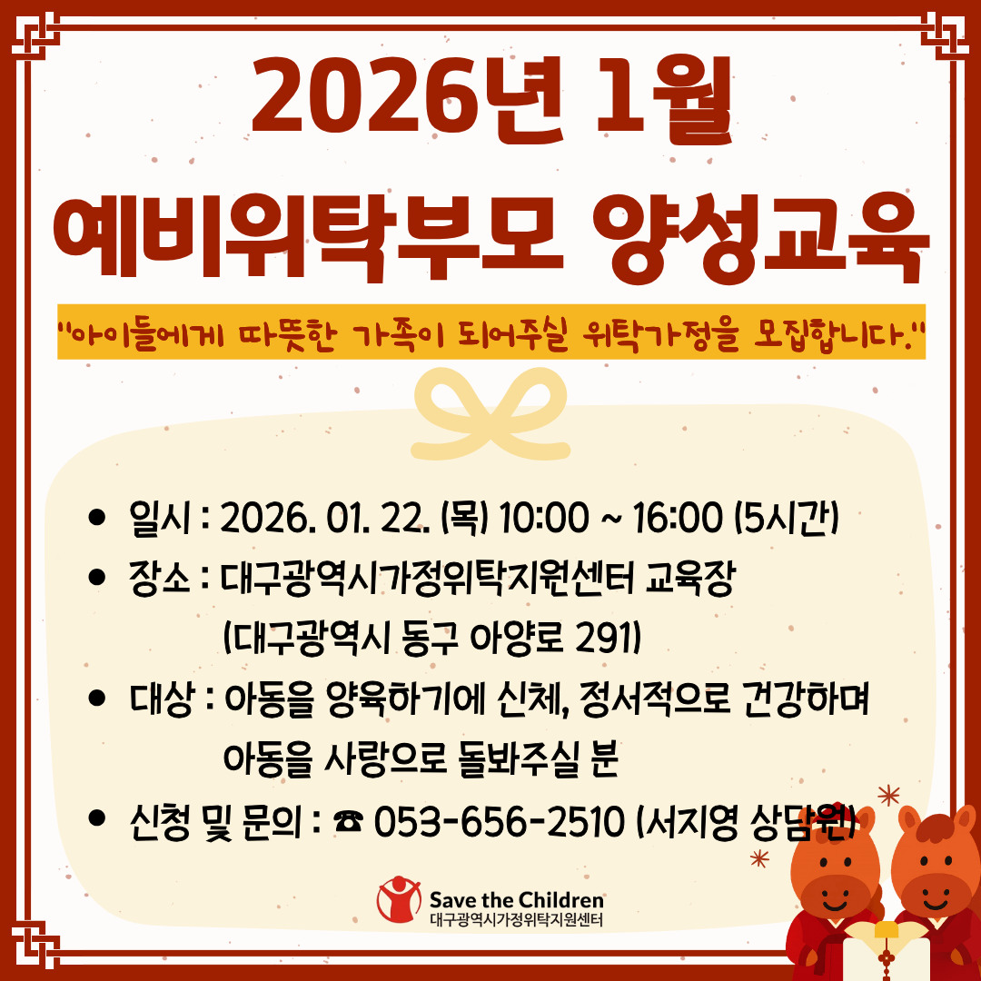 <2026³â 1¿ù ¿¹ºñÀ§Å¹ºÎ¸ð ¾ç¼º±³À°> ¾ÆÀ̵鿡°Ô µû¶æÇÑ °¡Á·ÀÌ µÇ¾îÁÖ½Ç À§Å¹°¡Á¤À» ¸ðÁýÇÕ´Ï´Ù! À§Å¹ºÎ¸ð°¡ µÇ±â À§ÇÑ,¿¹ºñÀ§Å¹ºÎ¸ð ¾ç¼º±³À° ¾È³»µå¸³´Ï´Ù. •°¡Á¤À§Å¹À̶õ? Ä£ºÎ¸ðÀÇ ¿©·¯ »çÁ¤(ÀÌÈ¥,»çº°,¼ö°¨,°æÁ¦Àû ¾î·Á¿ò µî)À¸·Î Ä£°¡Á¤¿¡¼ ÀÚ¶ö ¼ö ¾ø´Â ¾Æµ¿À» ÀÏÁ¤ ±â°£ À§Å¹ °¡Á¤¿¡¼ ¾çÀ°ÇÏ´Â ¾Æµ¿º¹Áö ¼ºñ½º •À§Å¹¾Æµ¿ ¾çÀ° Áö¿ø»çÇ× »ý°è±Þ¿© ¹× Áְű޿©,ÀÇ·á±Þ¿©,°¡Á¤¾çÀ°¼ö´ç/¿µ¾Æ¼ö´ç(ÇØ´ç °¡Á¤¿¡ ÇÑÇÔ),¾çÀ°º¸Á¶±Ý(ÀϽÃÀ§Å¹ Á¦¿Ü),¾Æµ¿¿ëǰ±¸ÀÔºñ,»óÇØº¸Çè °¡ÀÔ,½É¸®°Ë»ç¡¤Ä¡·áºñ,ºÎ¸ð±³À°,»ç·Ê°ü¸® µî •±³À°ÀϽà - 1¿ù 22ÀÏ ¸ñ¿äÀÏ 10½Ã~ 16½Ã(5½Ã°£)/*±â°ü »óȲ¿¡ µû¶ó º¯µ¿µÉ ¼ö ÀÖÀ½. •±³À°Àå¼Ò -´ë±¸±¤¿ª½Ã°¡Á¤À§Å¹Áö¿ø¼¾ÅÍ ±³À°Àå(´ë±¸ µ¿±¸ ¾Æ¾ç·Î291) •±³À°´ë»ó -ÀϹÝÀ§Å¹ºÎ¸ðÀÇ ÀÚ°Ý ¿ä°ÇÀ» ¸ðµÎ ÃæÁ·ÇÑ ÀÚ ÀϹÝÀ§Å¹ºÎ¸ð ÀÚ°Ý ¿ä°Ç: ¨çÀ§Å¹¾Æµ¿À» ¾çÀ°Çϱ⿡ ÀûÇÕÇÑ ¼öÁØÀÇ ¼ÒµæÀÌ ÀÖ´Â °¡Á¤ ¨è³ªÀ̰¡ 25¼¼ ÀÌ»óÀ̸ç,À§Å¹¾Æµ¿°úÀÇ ³ªÀÌ Â÷À̰¡ 60¼¼ ¹Ì¸¸ÀÎ °¡Á¤ ¨éÁ¾±³ÀÇ ÀÚÀ¯¸¦ ÀÎÁ¤Çϰí,À§Å¹¾Æµ¿À» ½Åü¡¤Á¤¼ÀûÀ¸·Î °ÇÀüÇÏ°Ô ¼ºÀåÇÒ ¼ö ÀÖµµ·Ï Áö¿øÇÒ ¼ö ÀÖ´Â °¡Á¤ ¨ê18¼¼ ¹Ì¸¸ Ä£Àڳడ3¸í ÀÌÇÏÀÎ °¡Á¤,¼º¹üÁË,°¡Á¤Æø·Â,¾Æµ¿Çдë,¸¶¾à,¾ËÄÚ¿Ã,¾à¹°Áßµ¶,Á¤½ÅÁúȯ µîÀÇ Àü·ÂÀÌ ¾ø´Â °¡Á¤ ¡ØÀü¹®°¡Á¤À§Å¹:°¡Á¤À§Å¹ º¸È£°¡ ÇÊ¿äÇÑ ¾Æµ¿ Áß 36°³¿ù ¹Ì¸¸ ¾Æµ¿,Çдë ÇÇÇØ ¾Æµ¿,°æ°è¼± Áö´É ¾Æµ¿,Àå¾Ö ¾Æµ¿ µîÀ» ¾çÀ°ÇÏ´Â °¡Á¤À§Å¹ Á¦µµ ¡ØÀü¹®À§Å¹ºÎ¸ð ÀÚ°Ý ¿ä°Ç:¡¸»çȸº¹Áö»ç¾÷¹ý¡¹¿¡ µû¸¥ »çȸº¹Áö»ç ÀÚ°Ý,¡¸¿µÀ¯¾Æº¸À°¹ý¡¹¿¡ µû¸¥ º¸À°±³»ç ÀÚ°Ý,¡¸À¯¾Æ±³À°¹ý¡¹¿¡ µû¸¥ ±³»ç ÀÚ°Ý,¡¸ÃÊ¡¤ÁߵÀ°¹ý¡¹¿¡ µû¸¥ ±³»çÀÇ ÀÚ°Ý,¡¸ÀÇ·á¹ý¡¹¿¡ µû¸¥ ÀÇ·áÀÎÀÇ ÀÚ°Ý,¡¸Ã»¼Ò³â±âº»¹ý¡¹¿¡ µû¸¥ û¼Ò³â»ó´ã»çÀÇ ÀÚ°Ý,´ëÇп¡¼ ½É¸®°ü·ÃÇÐ Àü°øÇÏ°í ¾Æµ¿¡¤Ã»¼Ò³â ½É¸®Ä¡·á °æ·Â3³â ÀÌ»óÀÎ ÀÚ •±³À° ½Ã°£Ç¥ ½Ã°£ | ³»¿ë | 09:50 ~ 10:00 | Á¢¼ö ¹× ¾È³» | 10:00 ~ 11:00 | ¹ýÀÎ ¹× ±â°ü ¼Ò°³ °¡Á¤À§Å¹º¸È£Á¦µµ ¾È³» | 11:00 ~ 13:00 | ¾Æµ¿ÇÐ´ë ¿¹¹æ ±³À° | 13:00 ~ 13:30 | Áᫎ | 13:30 ~ 14:30 | À§Å¹¾Æµ¿ÀÇ ÀÌÇØ | 14:30 ~ 15:10 | À§Å¹ºÎ¸ð°¡ µé·ÁÁÖ´Â °¡Á¤À§Å¹ ¾Æµ¿ Ű¿ì±â | °¡Á¤À§Å¹¼ºñ½º ¾È³» | 15:10 ~ 16:00 | ¸¸Á·µµÁ¶»ç ¹× ¼ö·áÁõ Àü´Þ |
